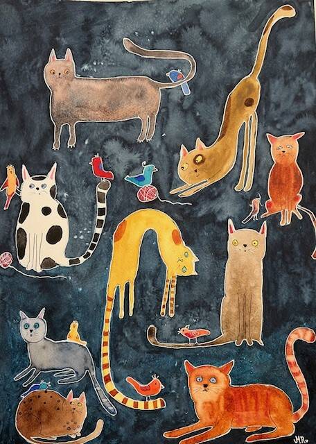 Til salgs, katter i trengsel. Kr. 3000,-. Fraktfritt, innrammet.